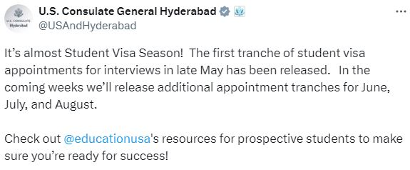 Last year, the U.S. Consulate General Hyderabad’s X handle announced that the first round of F-1 Visa Slots was rolled out on May 7, 2024. Many students secured interview slots for late May 2024, while others were still struggling to find accurate information regarding US Visa Scheduling and F-1 Visa Slot Availability. As per the X post, expect bulk F-1 Visa Slots in India from May 18-28, 2025, with potential date variations for September 2025 intake.